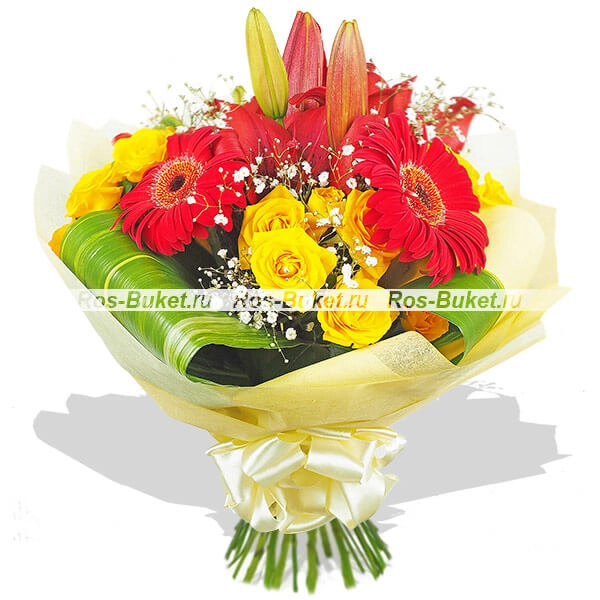 Стандартный (на фото): лилия красная - 2 шт, гербера красная - 2 шт, роза кустовая  желтая - 3 шт, гипсофила - 3 шт, лист аспидистры загнутый - 4 шт, фетр светный.